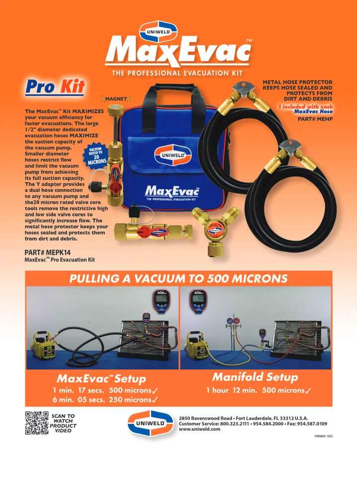 Uniweld MaxEvacâ„¢ Reusable Silicone Vacuum Kit is a double valve evacuation kit designed for fast, unrestricted vacuum in HVAC and refrigeration systems.
